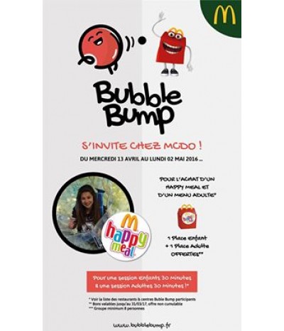 Du 13 avril au 02 mai 2016 ... Bubble Bump s'invite aux Mc Do ... Pour l'achat d'un Happy Meal et d'un menu adulte* : 1 place enfant + 1 place adulte OFFERTES **