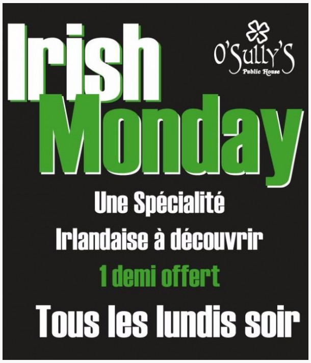 Chaque Lundi, O'Sully'S vous propose une spécialité culinaire irlandaise à découvrir et pour chaque plat commandé, 1 demi de bière au choix vous sera offert!!!