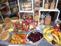 Fruits secs, Nid d'oiseaux, fruits divers frais, croissants fourrés, pates de fruits...