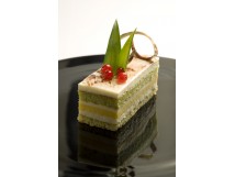 La Reine Margot, est un savoureux mélange d'un biscuit pain de gênes pistache, de crémeux ananas/mangue, et d'une mousse cocktail d'agrumes.