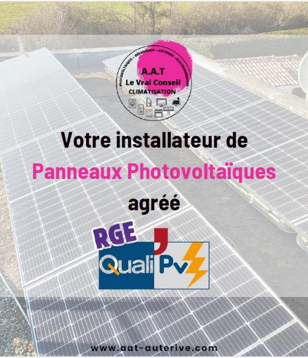 Vous souhaitez adopter une solution durable et réduire votre empreinte carbone ? A.A.T., à Auterive, est votre expert local en fourniture et pose de panneaux photovoltaïques. Avec nos certifications QUALIPV et RGE, nous vous garantissons une installation professionnelle, respectant les normes les plus exigeantes, pour un système performant et fiable.