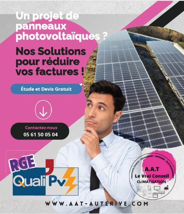 Vous rêvez de passer à l'énergie solaire et de profiter d'une solution énergétique durable ? A.A.T à Auterive est le choix parfait pour la fourniture et la pose de panneaux photovoltaïques. Grâce à nos certifications QUALIPV et RGE, nous vous assurons des installations de haute qualité réalisées par des experts compétents.