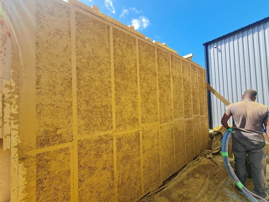 La paille et l'ossature bois : cette méthode est plus répandue. Elle consiste à "remplir" les montants de l'ossature en bois avec des blocs de paille rectangulaires. Les blocs de paille sont encastrés entre les poteaux en bois, formant une double ossature, et servent d'isolant. Les murs sont ensuite recouverts de terre et de chaux pour une finition à la peinture naturelle. Cette technique peut être préfabriquée en panneaux à assembler, ce qui accélère la construction.