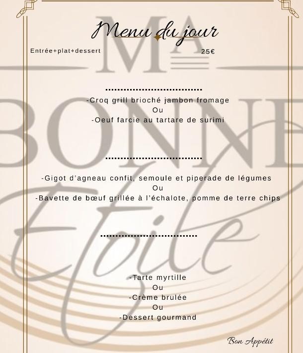 Bonjour à tous, l'équipe du restaurant Ma bonne étoile vous présente le menu du jour.