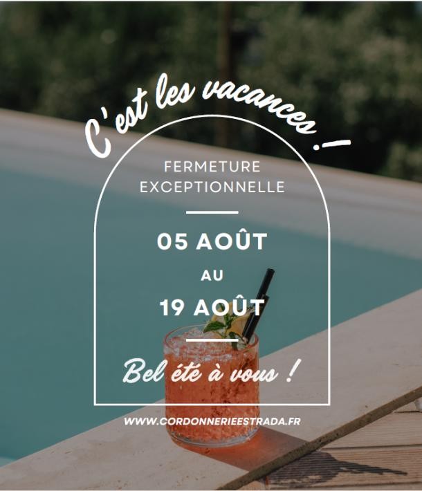 La Cordonnerie Estrada à Balma, sera en congés d'été du 5 août au 19 août inclus. Nous avons hâte de vous retrouver dès notre réouverture le 20 août, avec nos horaires habituels. Nous vous remercions pour votre compréhension et votre fidélité durant cette période.