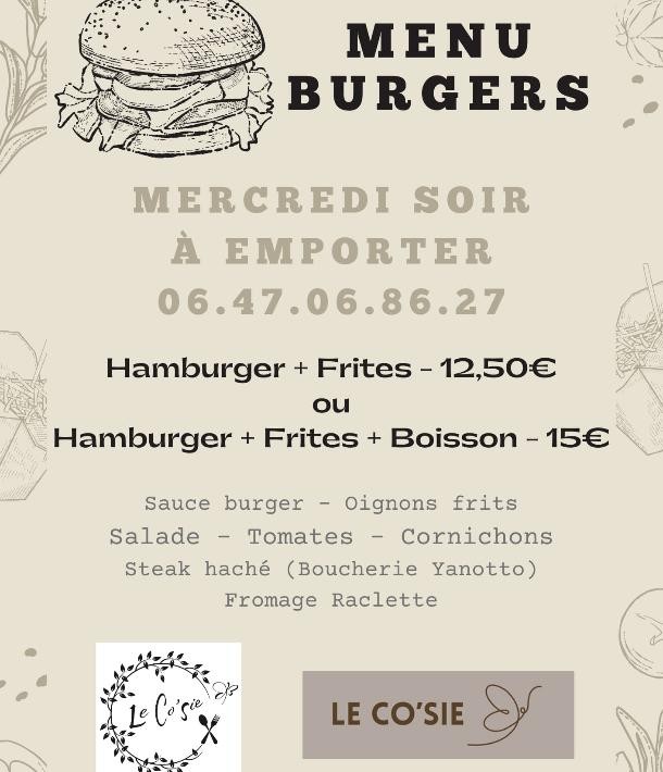 Tous les mercredis, venez goûter nos burgers maison. Préparés avec amour, ils combinent des ingrédients de première qualité pour un vrai régal :