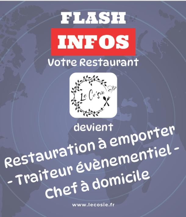 Restez connectés avec Le Co'sie pour ne rien manquer de nos actualités et offres spéciales à venir. Que ce soit pour un événement, un repas à emporter ou un atelier culinaire, notre passion pour la cuisine restera toujours à vos côtés !