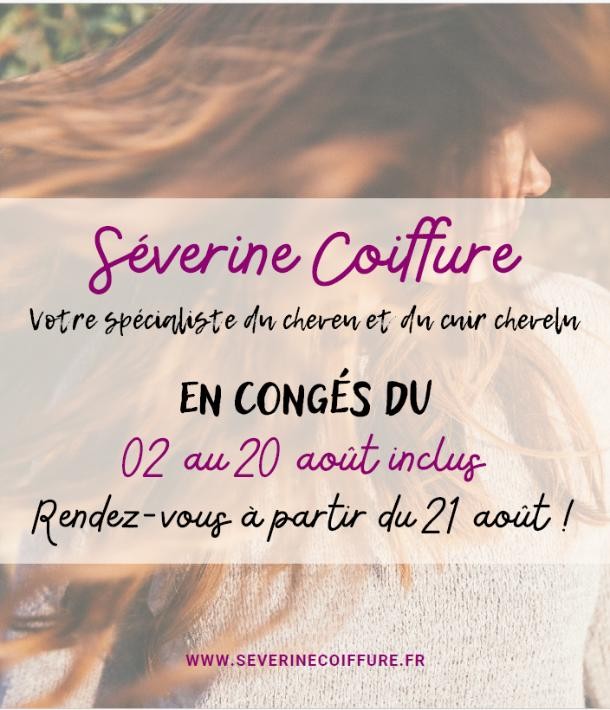Pour bien préparer la rentrée, pensez à prendre rendez-vous dès aujourd’hui ! Séverine Coiffure sera en congés du 2 au 20 août inclus. Les prestations reprendront à partir du 21 août, avec les créneaux qui s’ouvrent déjà à la réservation. Que vous ayez besoin d’un entretien capillaire, d’un accompagnement spécifique pour la chute de cheveux ou simplement d’un moment de bien-être, n’attendez pas le dernier moment.