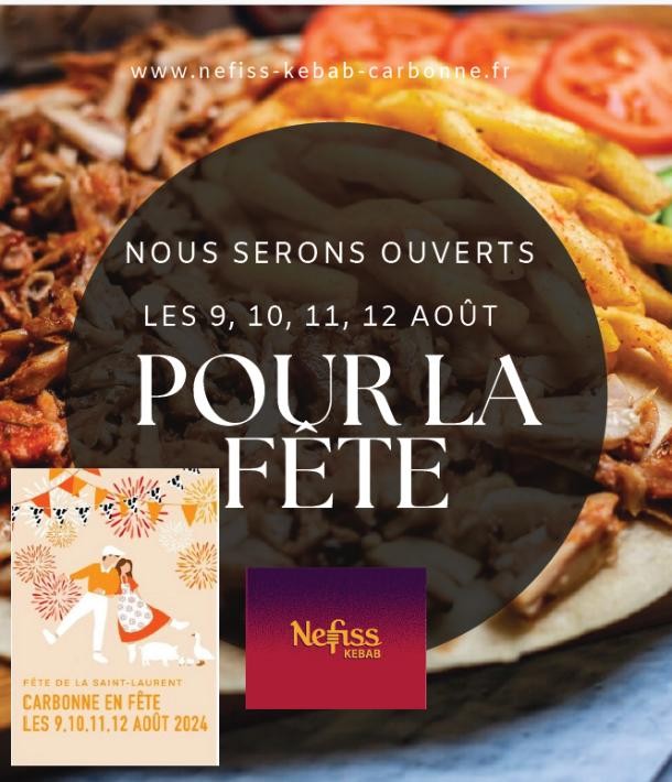 Nefiss Kebab à Carbonne est heureux de vous annoncer que nous serons ouverts aux horaires habituels durant la fête de la Saint Laurent, les 9, 10, 11 et 12 août. Venez célébrer cette fête locale avec nous et profitez de nos délicieux kebabs et spécialités turques.