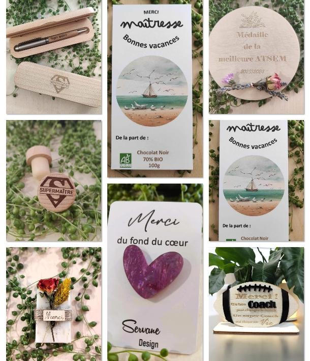 Chez Servane Concept Store, à Carbonne, découvrez notre sélection unique d'idées cadeaux personnalisables pour remercier les maîtres, maîtresses, atsem, coachs, nounous, et plus encore. Nos produits, tels que les coffrets de stylos élégants, carnets raffinés, tablettes de chocolat gourmandes, savons artisanaux, magnets, pins, bracelets, bouchons de bouteille et totems décoratifs, sont pensés pour marquer l'occasion de manière spéciale.