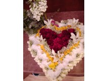 Coeur de deuil composé de roses, lys, fleurs d'orchidées phalaenopsis, oeillets, gypsophyles, giroflées, chrysanthèmes et du feuillage d'eucalyptus.