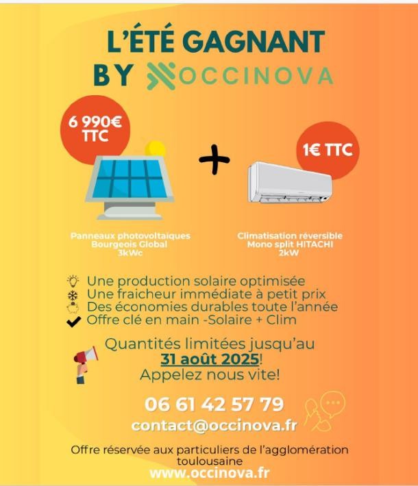 Spécialiste de l’électricité générale, du photovoltaïque, des bornes de recharge et de la climatisation, Occinova s’impose comme un acteur de référence à Cugnaux et dans toute l’agglomération toulousaine. Avec une expertise reconnue et un engagement fort pour l’efficacité énergétique, l’entreprise lance une offre inédite à destination des particuliers souhaitant allier confort thermique et économies d’énergie.
