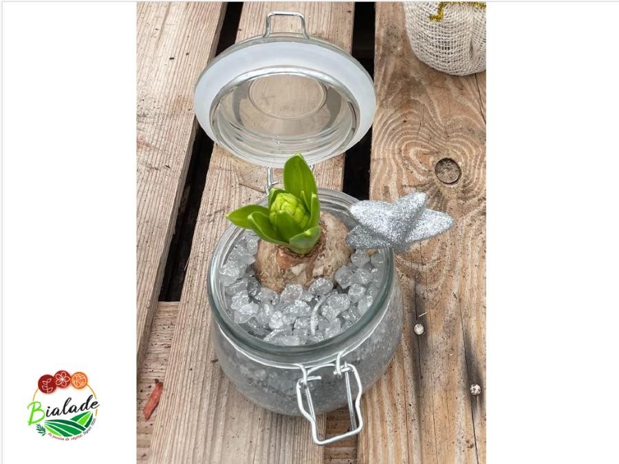 Arrangement bocal avec jacynthe. Idéal pour offrir ou mettre sur la table en décoration.