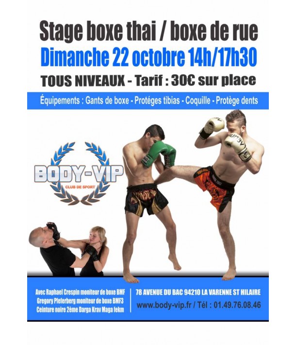 Body Vip vous proposeun nouveau Stage de boxe Thai / boxe de rue tous niveaux - tarif 30 euros sur place. 78, avenue du Bac 94210 La Varenne Saint Hilaire