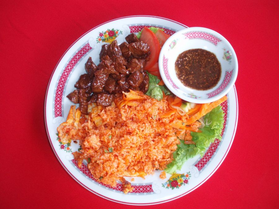 Riz sauté au sauce tomate, ciboulettes avec des morceaux de boeufs. Dragon Céleste, restaurant chinois, thaïlandais, vietnamien à Saint Maur des Fossés (94).