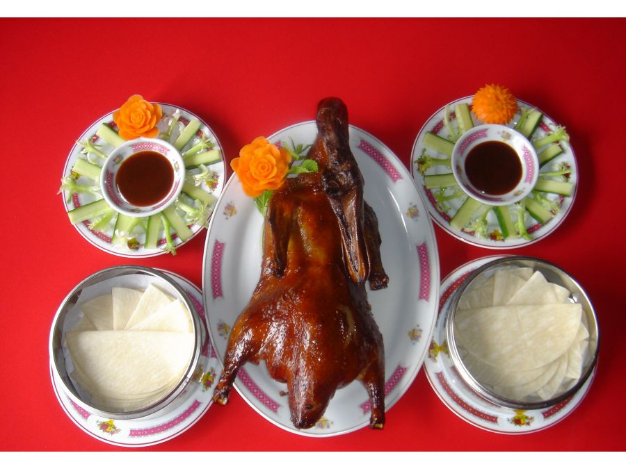 Peau de canard croustillant roulé avec une crêpe, ciboulette, concombre et sauce barbecue. soupe de vermicelle de soja avec la viande de canard. Nouilles sauté avec la viande de canard. Cinq légume sauté avec de la viande de canard. (pour 4 pers.) Dragon Céleste, restaurant chinois, thaïlandais, vietnamien à Saint Maur des Fossés (94).
