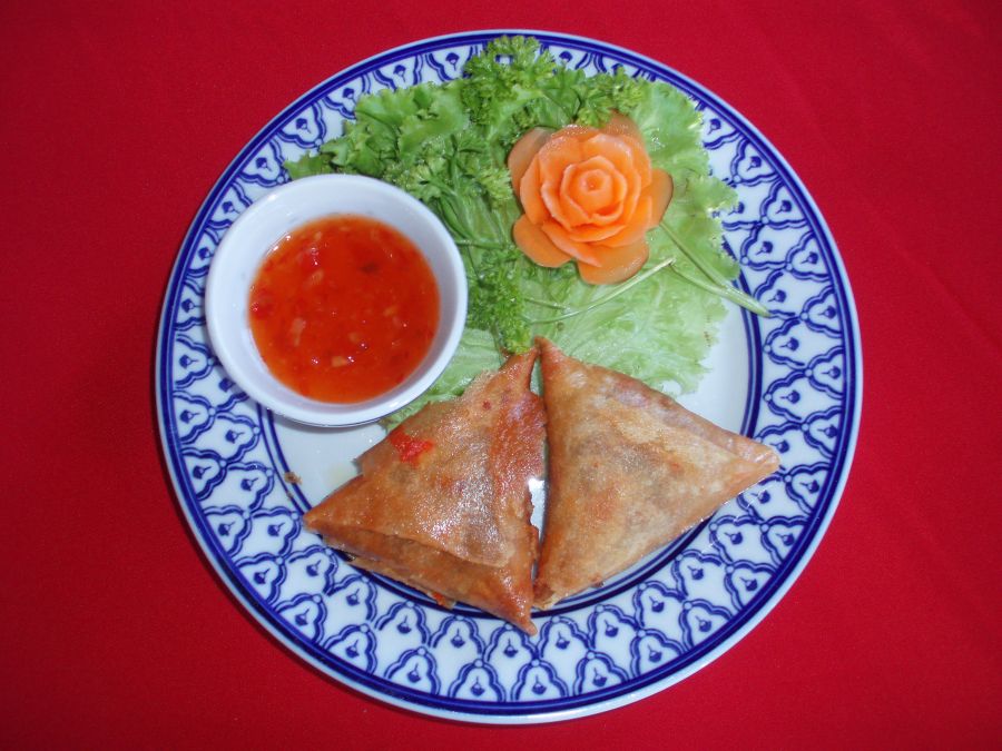 Sa-moussa au bœuf ou aux Légumes avec sauce léger pimentée. Dragon Céleste, restaurant chinois, thaïlandais, vietnamien à Saint Maur des Fossés (94).