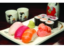 >Salade, riz, soupe< 3 pièces de sushis ,6 makis et 5 brochettes variés ( poulet, boulettes de poulet, ailes de poulet, boeuf et boeuf fromage ) à 17.50 euros
