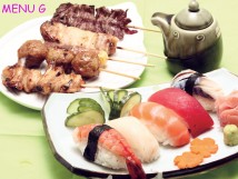 5 sashimis assortis 5 brochettes : 1 poulet, 1 boulette de poulet, 1 fromage, 1 aile de poulet, 1 boeuf 1 soupe, 1 salade, 1 riz