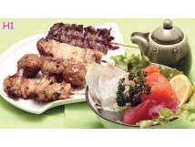9 sashimis assortis 5 brochettes : 1 poulet, 1 boulette de poulet, 1 fromage, 1 aile de poulet, 1 boeuf 1 soupe, 1 salade, 1 riz