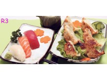 3 sushi assortis 6 raviolis japonais 1 soupe, 1 salade, 1 riz