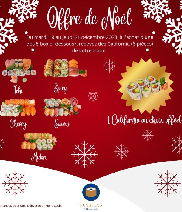 Ho ho ho, c'est Noël avant l'heure chez Sushilab ! 🎅 du mardi 19 au jeudi 21 décembre 2023, lorsque vous commandez une de nos 5 Box (Ichi, Spicy, Cheesy, Saveur ou Midori), on vous offre une boîte de California au choix ! 🤩