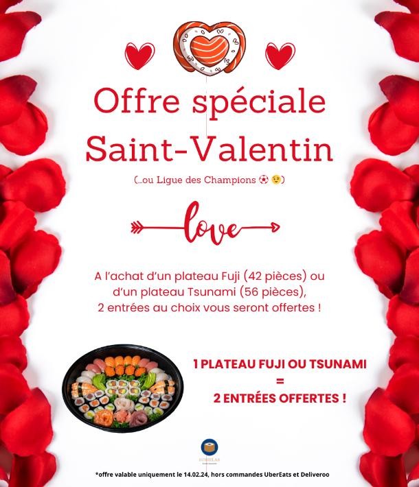 A l'achat d'un plateau Fuji (42 pièces) ou Tsunami (56 pièces), 2 entrées au choix vous seront offertes.