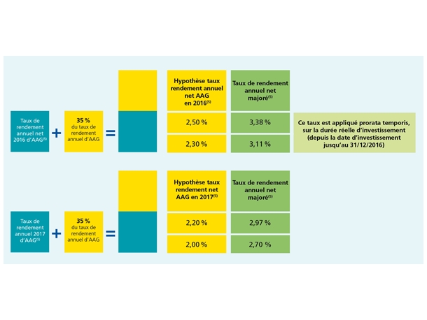Un complément de rémunération de 20 % ou 35 % du taux de rendement global du support en euros Aviva Actif Garanti en 2016 et/ou 2017 Offre valable du 6 juillet 2016 au 30 juin 2017 Grâce à Aviva Multi Bonus 2017, la part de votre versement ou arbitrage investie sur le support en euros Aviva Actif Garanti peut bénéficier d´un complément de rémunération du taux de rendement global d´Aviva Actif Garanti en 2016 et/ou en 2017. L'INVESTISSEMENT SUR DES UNITES DE COMPTE PRESENTE UN RISQUE DE PERTE EN CAPITAL. Pour plus de précisions, regardez notre vidéo sur l'onglet prévu à cet effet.