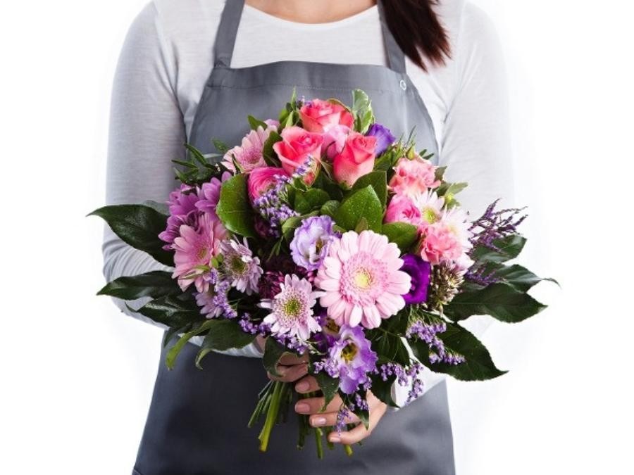 Bouquet rond de fleurs de saison camaieu parme et rose. Chez Boutic'Flor, votre fleuriste à Lavaur (81).