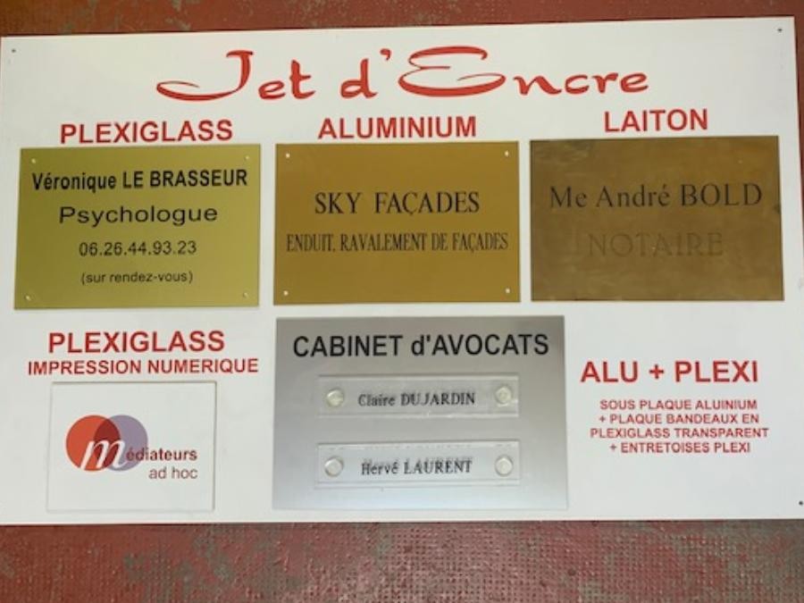 Retrouvez également chez Jet d’Encre toute une gamme de plaques professionnelles en plastique, plexiglass, laiton ou aluminium.