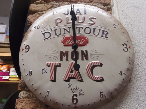Très belle horloge en métal épais, forme bombée et visuel en relief pour une ambiance rétro vintage humoristique. J'ai plus d'un tour dans mon tic tac tic tac...