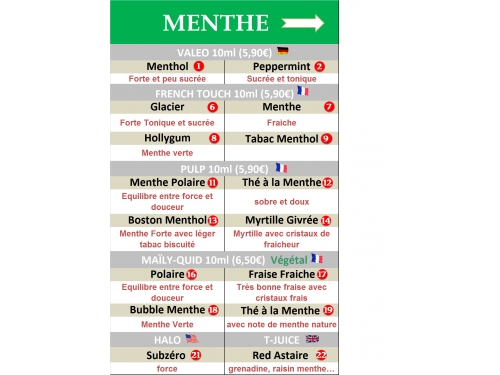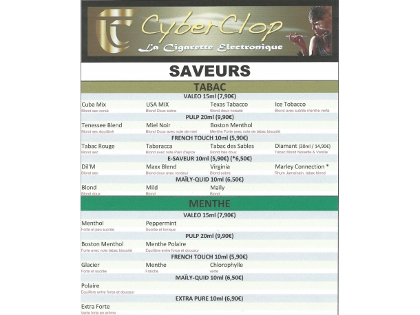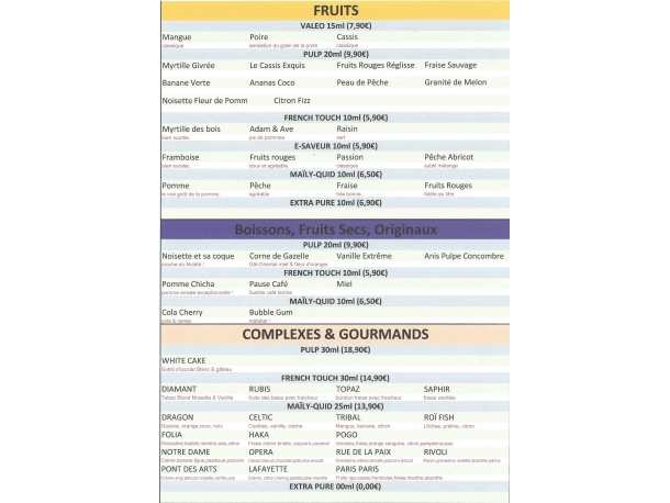 MAÃLY-QUID (France 78) 100% Végétal 10ml 6.50€ VG/PG (40/60 et 50/50) Esaveur (france 77) 10ml 5.90€ / gold 6.50€ French Touch (France champigny) 10ml 5.90€ Tasty (France champigny) 10ml: 5.90€ (60/40) Pulp (France) 10ml 5.90€ / Cult 10ml 6.30€ (50/50) Valéo (allemagne) 10ml 5.90 (45/55) Hallo (USA) 10ml 8.90€ Red Aster (Anglais) 10ml 7.30€ Dinner Lady 10ml (Anglais) (70/30) 7.90€ AVAP Red Devil (Français) 10ml (50/50) 5.90€ Milas Macaron (USA) 10ml (70/30) 7.50€