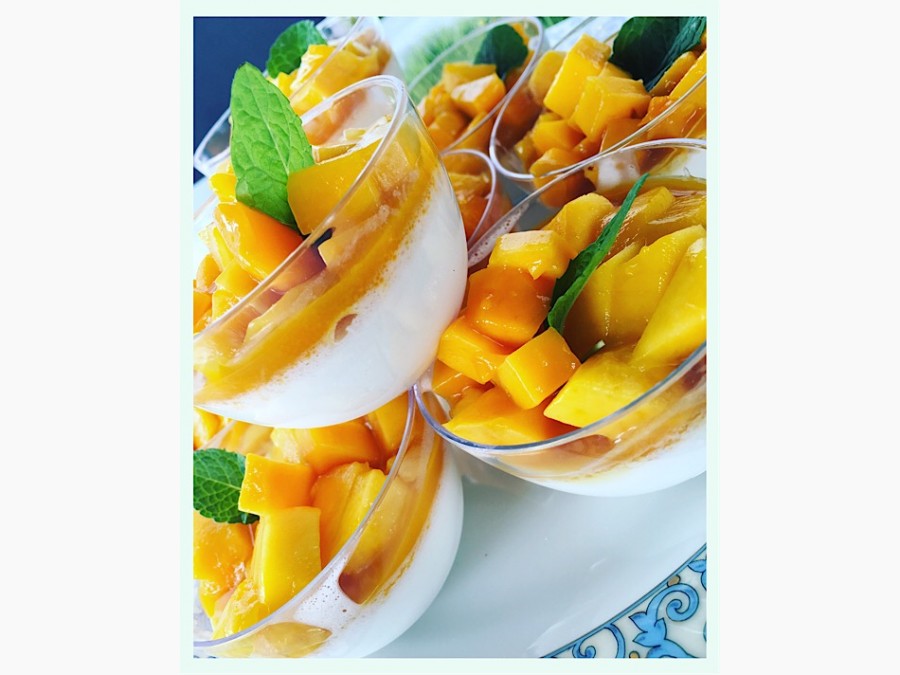Verrines au lait de chèvre , lait de coc, coulis de Mangue-Abricot, Mangue fraîche