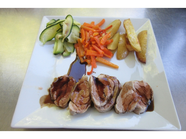 Filet mignon sauce aigre-douce au cognac, accompagné de légumes. Chez Tavernes d'Hautpoul, spécialités portugaises à Mazamet (81).