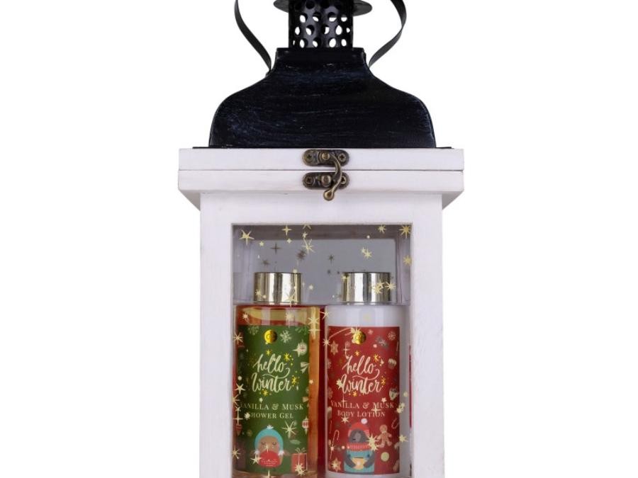 superbe lanterne contenant un gel douche + un lait corps + une fleur de massage