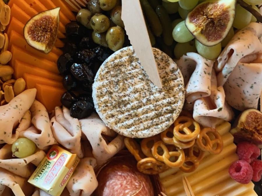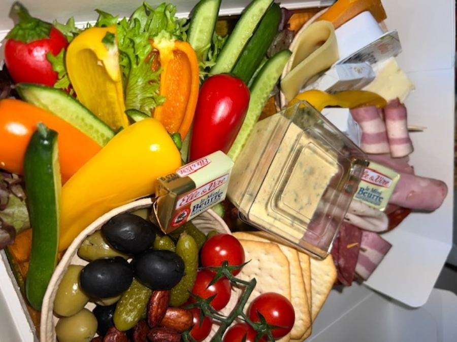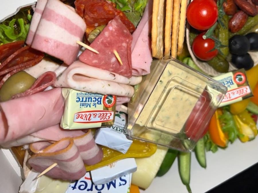 Un plateau de charcuteries, crudités avec sauce maison, fromages, fruits secs, pains frais, crackers...