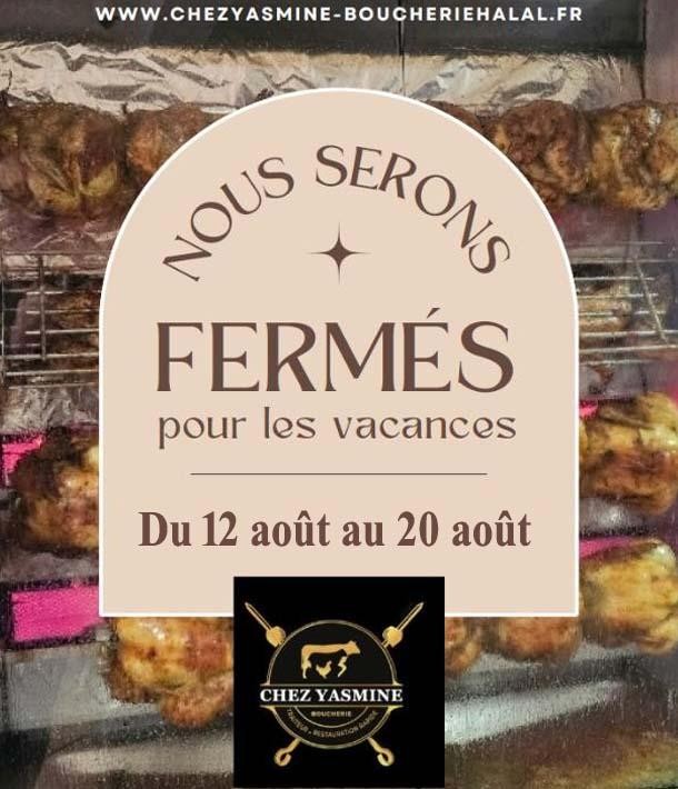 Chez Yasmine, votre boucherie, traiteur et restaurant rapide halal à Muret, s'accorde une courte pause estivale bien méritée. Pour cette raison, l'établissement sera fermé du 12 août au 20 août inclus. Cette fermeture temporaire nous permettra de revenir encore plus motivés pour vous proposer le meilleur de nos produits et services halal.