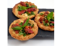 Pâte feuilletée, Mozzarella cerise, Tomate cerise, Tomate confite, huile d'olive, basilic frais.
