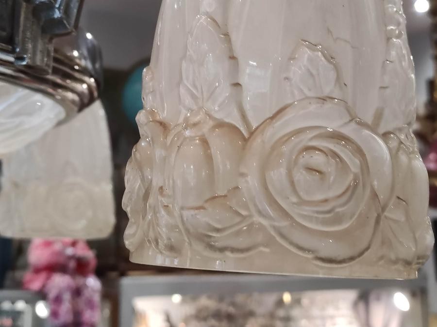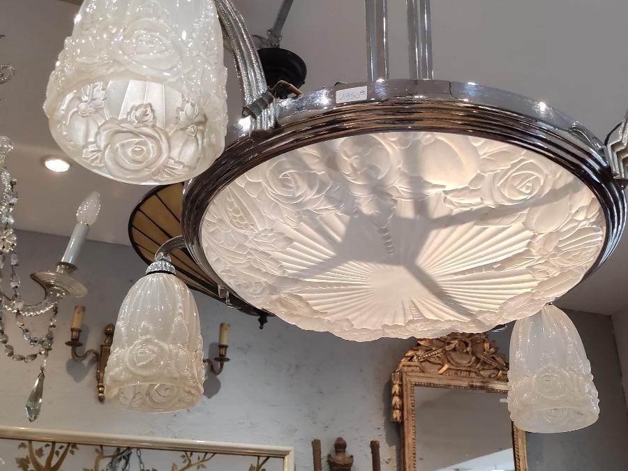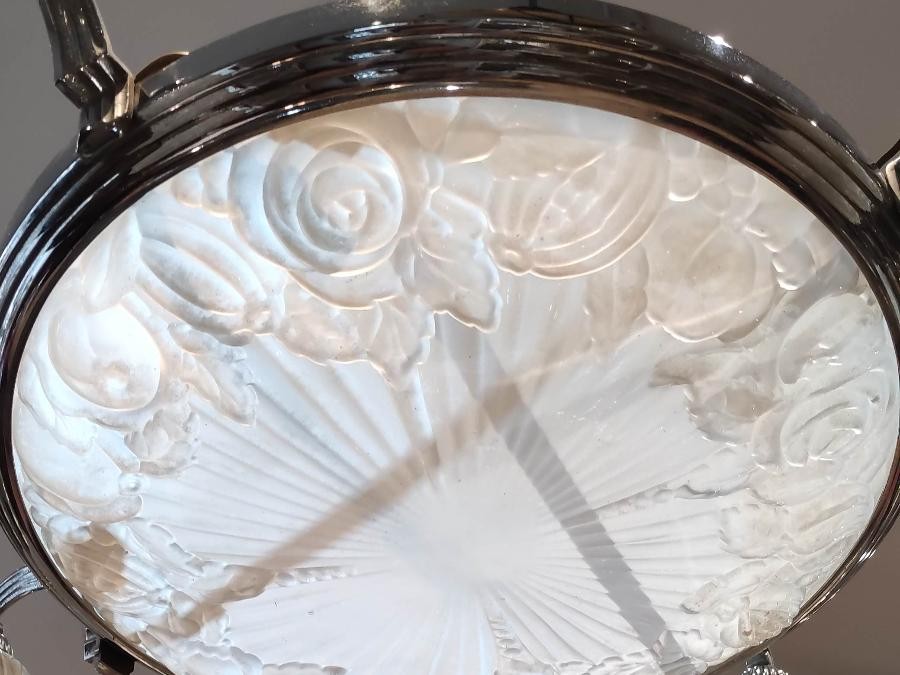 Grand lustre Art déco en pâte de verre opalin et métal chromé