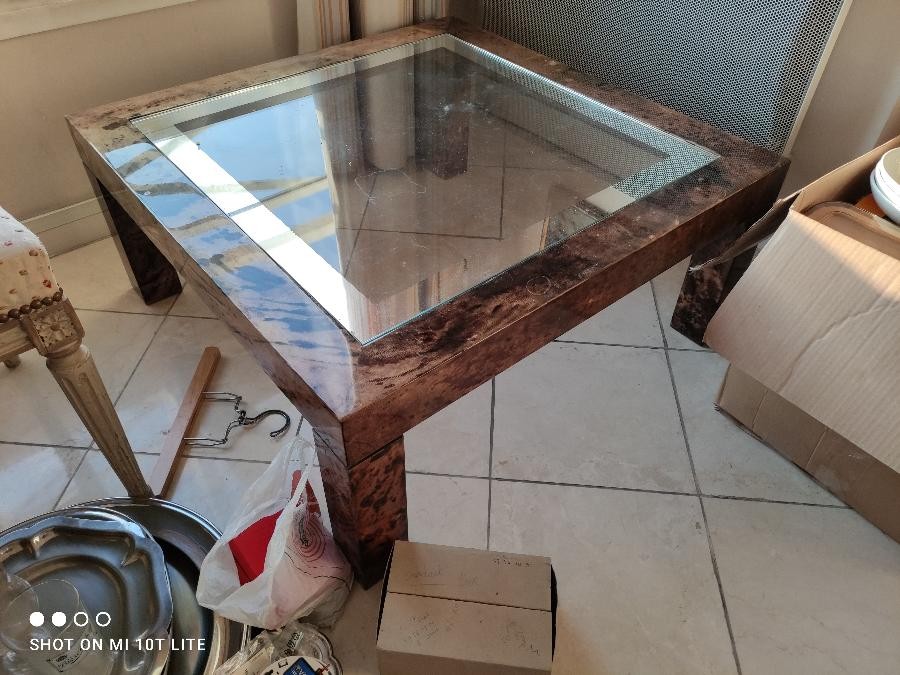 Table basse vintage plaquée d'un revêtement de galuchat et plateau de verre au centre.