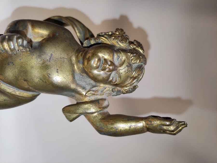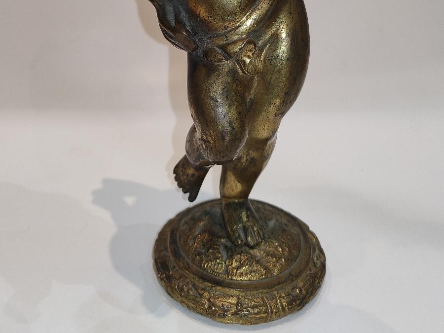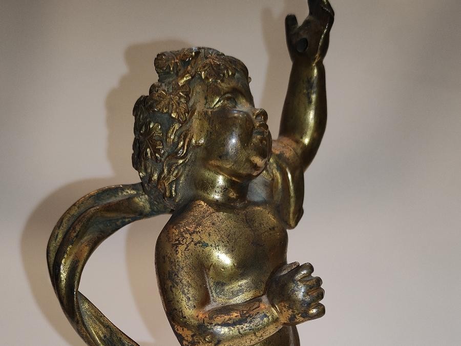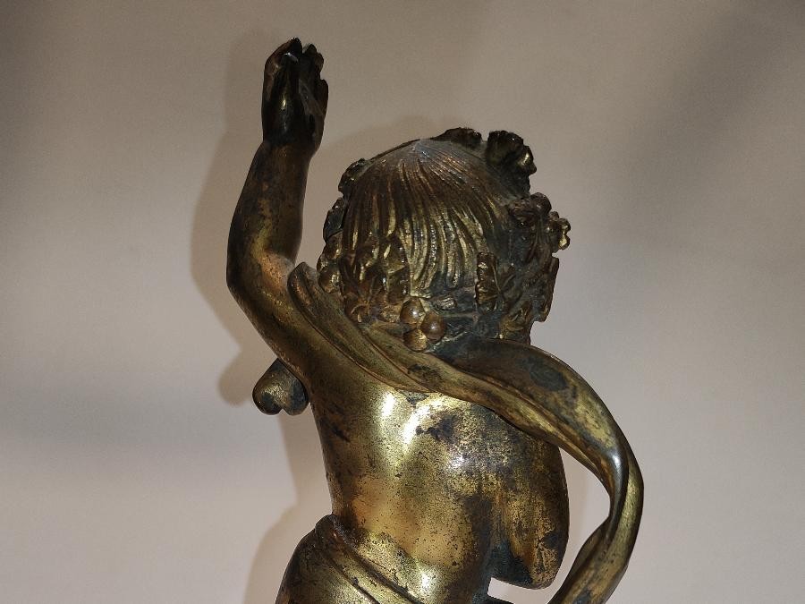 Angelot en bronze à patine dorée (manques de patine) sur socle