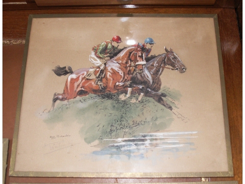 paire de gravures rehaussées à la gouache, signées Eugène Péchaubes, thème hippiquesous-verre 25 x 21 cmtrès bon état de conservation