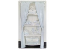 Panier de toilette : 45,00 euros / Cabas : 89,00 euros / Bottines de bain : 28,00 euros / sac petit linge : 45,00 euros / Baluchon : 39,00 euros / bavoir brodé : 16,00 euros .....