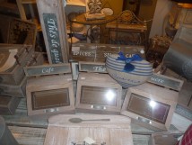 Une cuisine au parfum d'autrefois, avec toute cette collection d'objets de décoration, porte-serviettes, boîte à thé, boîte à couverts, café, sucre, porte-sopalin, plateaux .... etc ... le tout joliment fabriqué en bois naturel patiné relevé d'une petite touche en zinc rappelant les cuisines de nos grands mamans.