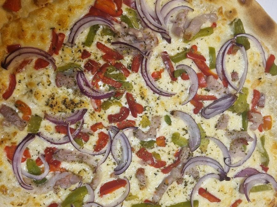 Crème fraîche, cantal, oignons rouges, poivrons, lardons, origan