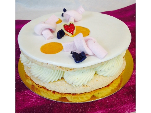 Gâteau réalisé pour la fêtes des grand-mère. Il se compose d'un biscuit macaron, d'une mousse crème brûlée et d'une compotée d'abricot en son centre.