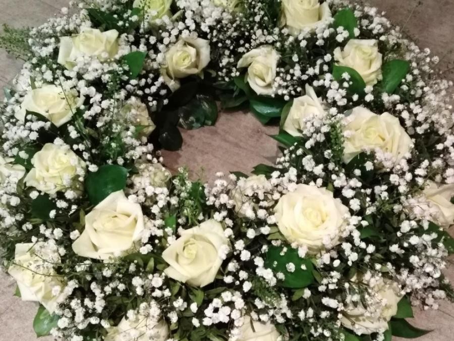 Réalisation de couronne de roses blanches pour deuil à Saint-Jean