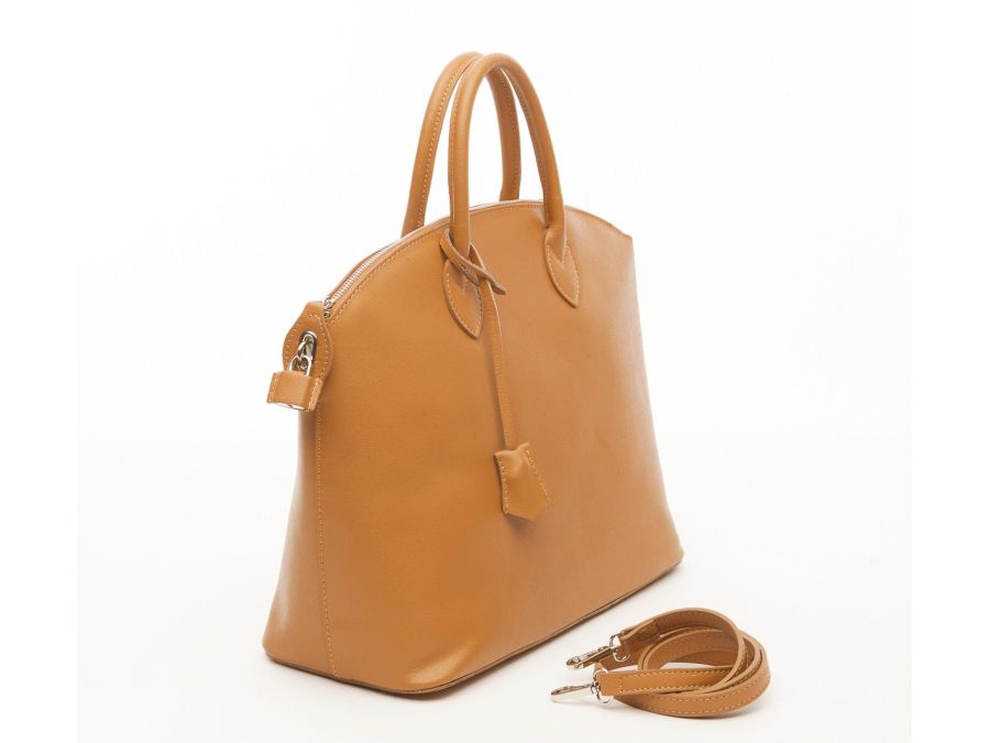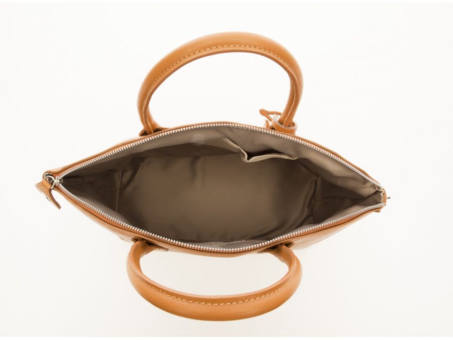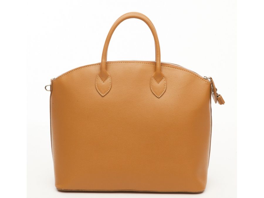 Sac porté main en cuir grainé camel. Il possède une grande poche intérieure. Il dispose d'une fermeture à cadena ainsi que d'une bandoulière.