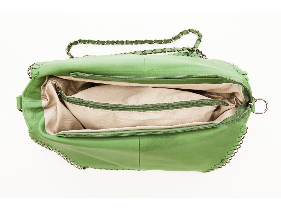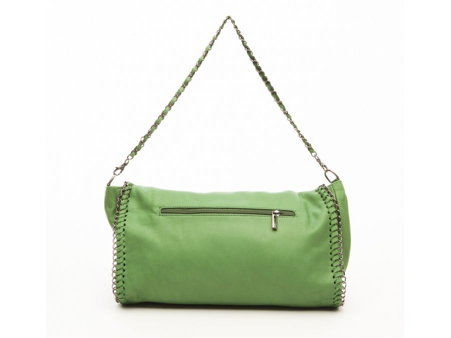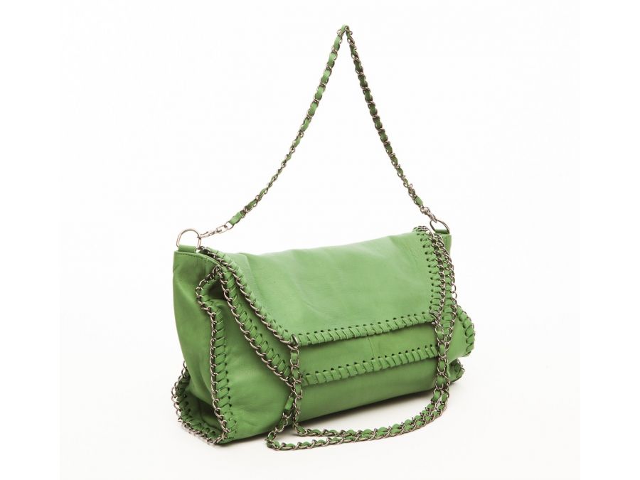 Sac cuir souple porté épaule vert. Il dispose de chaines qui lui donnent un style très mode !