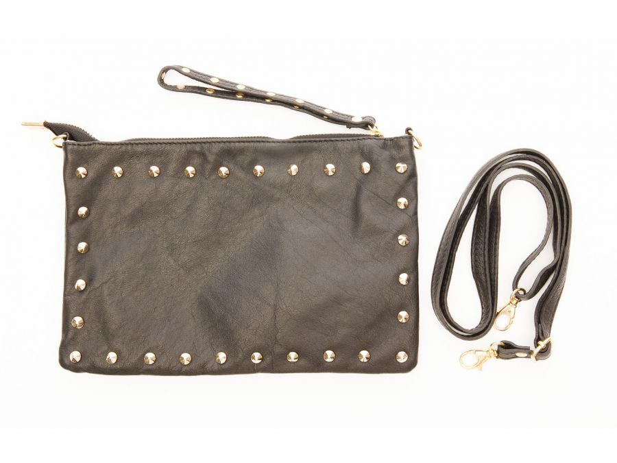 Réalisée en cuir souple de vachette, cette pochette ornée de clous est à la fois très pratique et chic ! Elle apportera une touche rock à votre tenue ! Vous pouvez la porter selon votre convenance à la main, à votre poignet ou en bandoulière. Elle est doublée en coton noir et se ferme grâce à un zip. Finition de qualité.